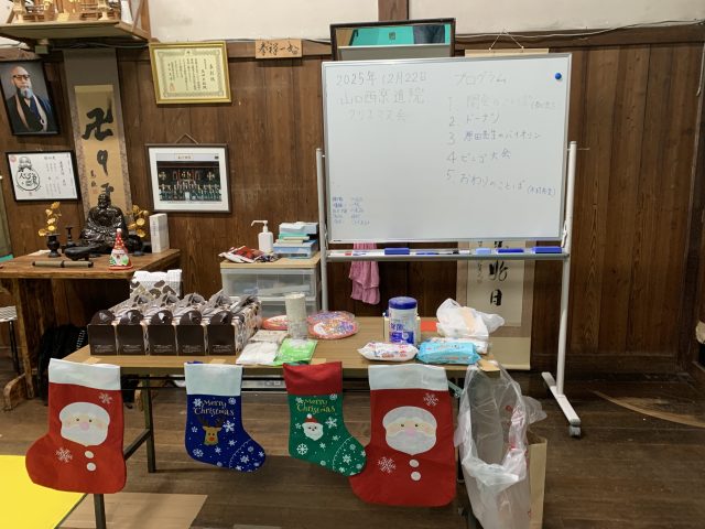 令和7年の山口西京道院の締めくくりの行事として少年部のお楽しみ会と一般の部の忘年会&大掃除を